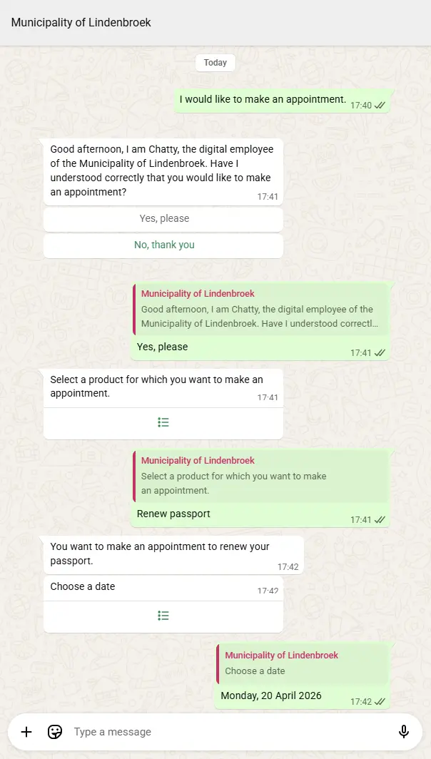 When a chatbot becomes part of that process and connects to underlying systems such as an appointment tool, the experience changes immediately. Rather than sending citizens elsewhere, you guide them step by step within the same conversation.