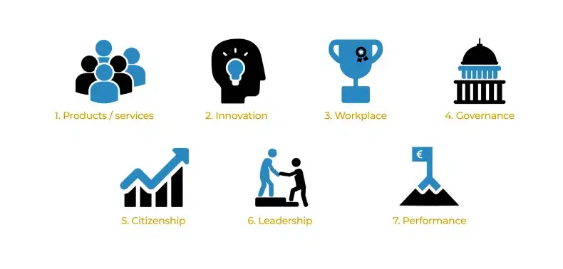 These elements combined form a reputation score. The pillars externally measure the attitudes among the target groups about various topics that have to do with your organisation. In addition to consumers, the opinions of important stakeholders are also included. The 7 dimensions on which an organisation is assessed: