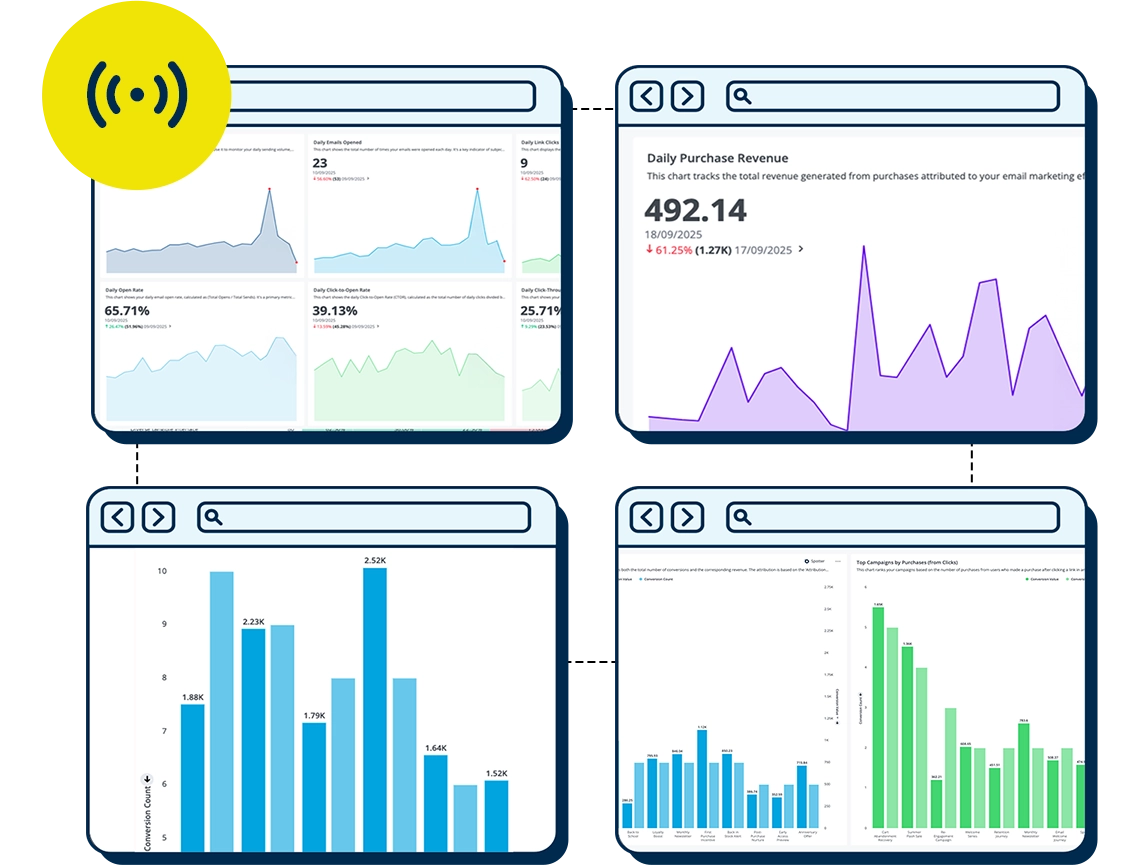 Die Standard-Widgets in deinem Liveboard geben dir ein vollständiges Bild deiner E-Mail-Performance über die Zeit. Beispiele für verfügbare Widgets: