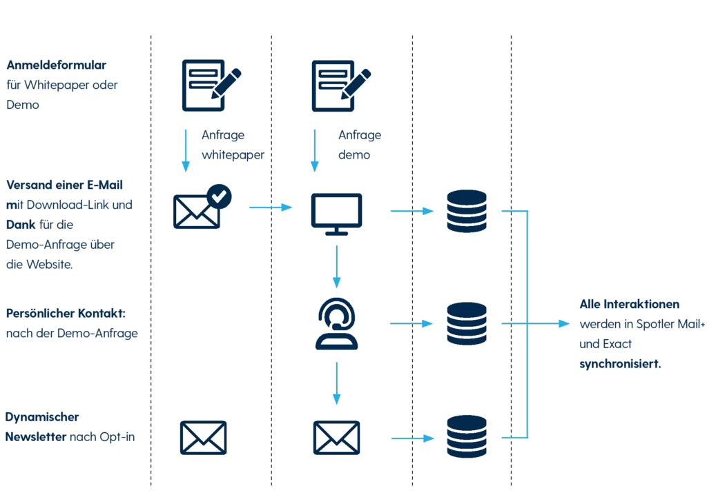 Die Informationen aus den Formularen dienen Spotler nicht nur als Trigger für den Versand einer Dankes-E-Mail mit einem Link zum angeforderten Whitepaper, sondern sie werden auch in den Kundenkontaktkarten von Exact Synergy gespeichert. Sobald das SQL-Feld in der Datenbank ausgefüllt wird, kann der Vertrieb aktiv werden: Alle Leads, die eine Online-Demo anfragen, werden persönlich kontaktiert.
