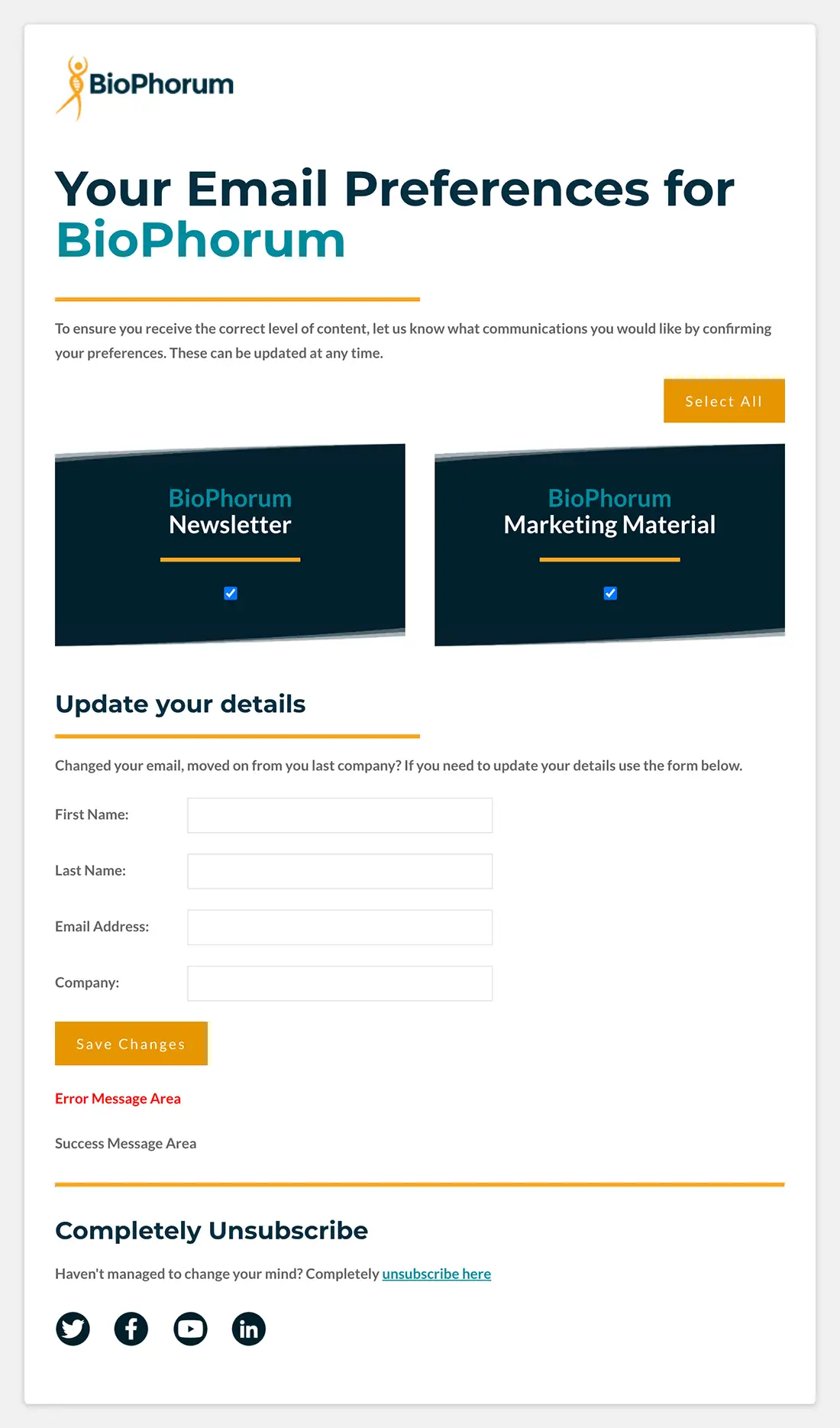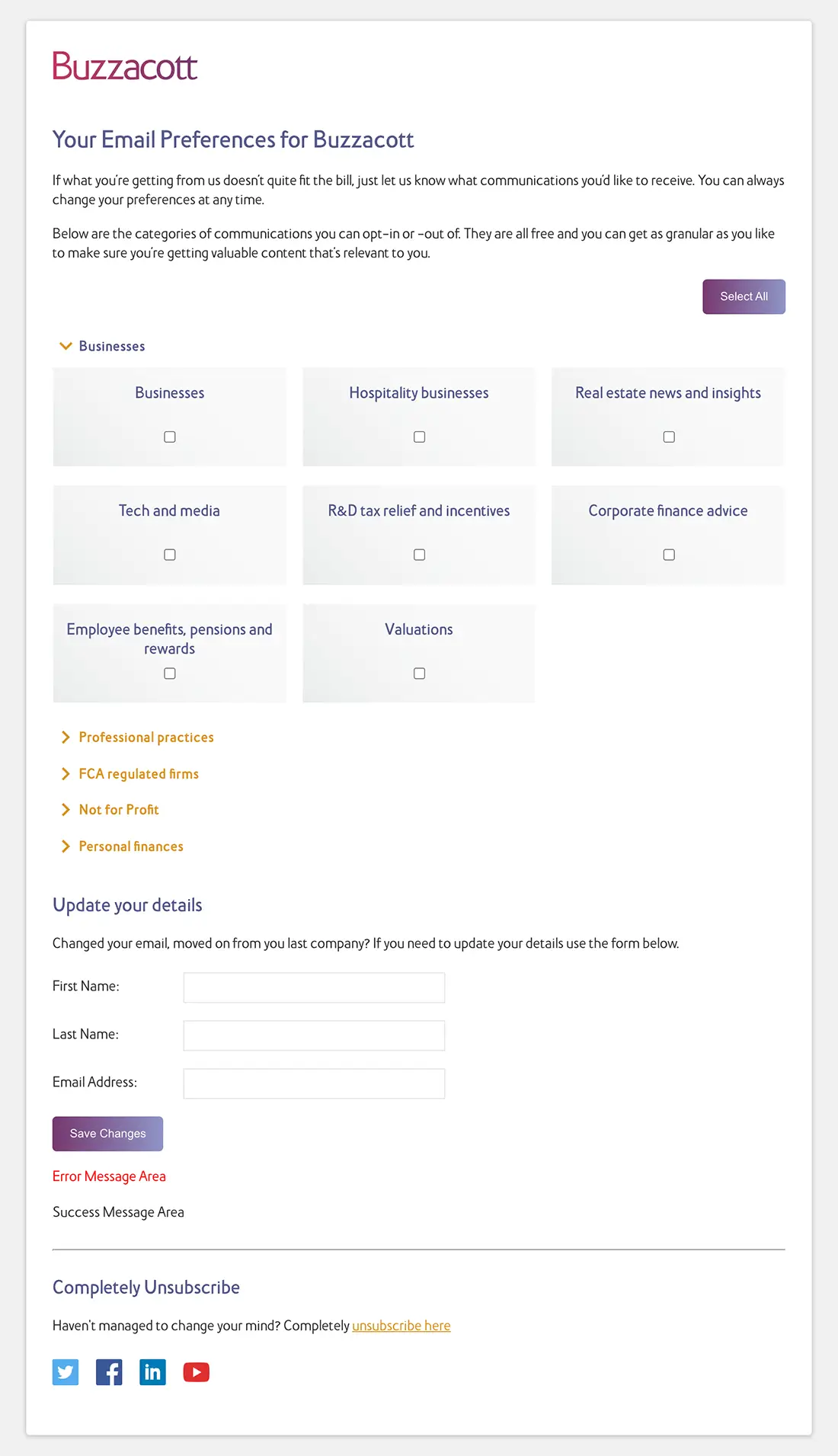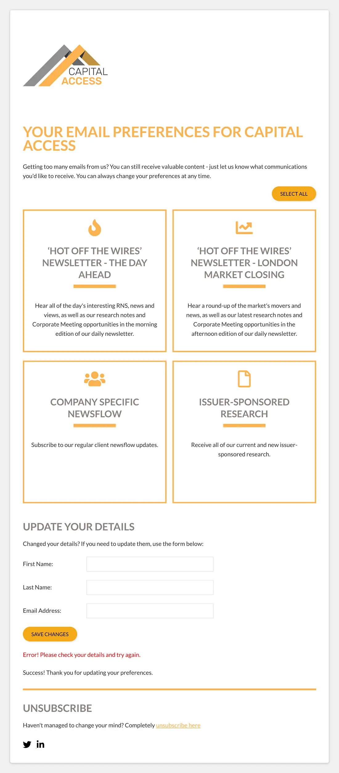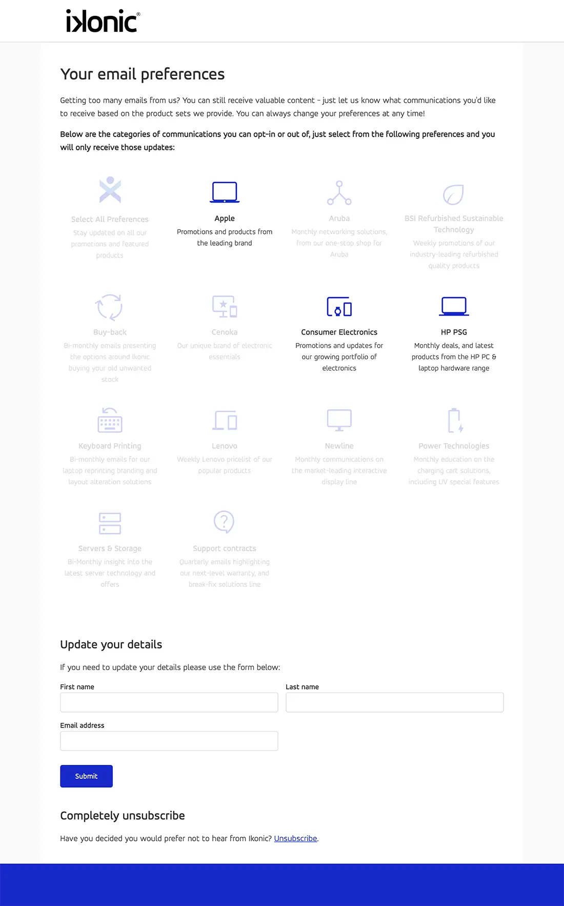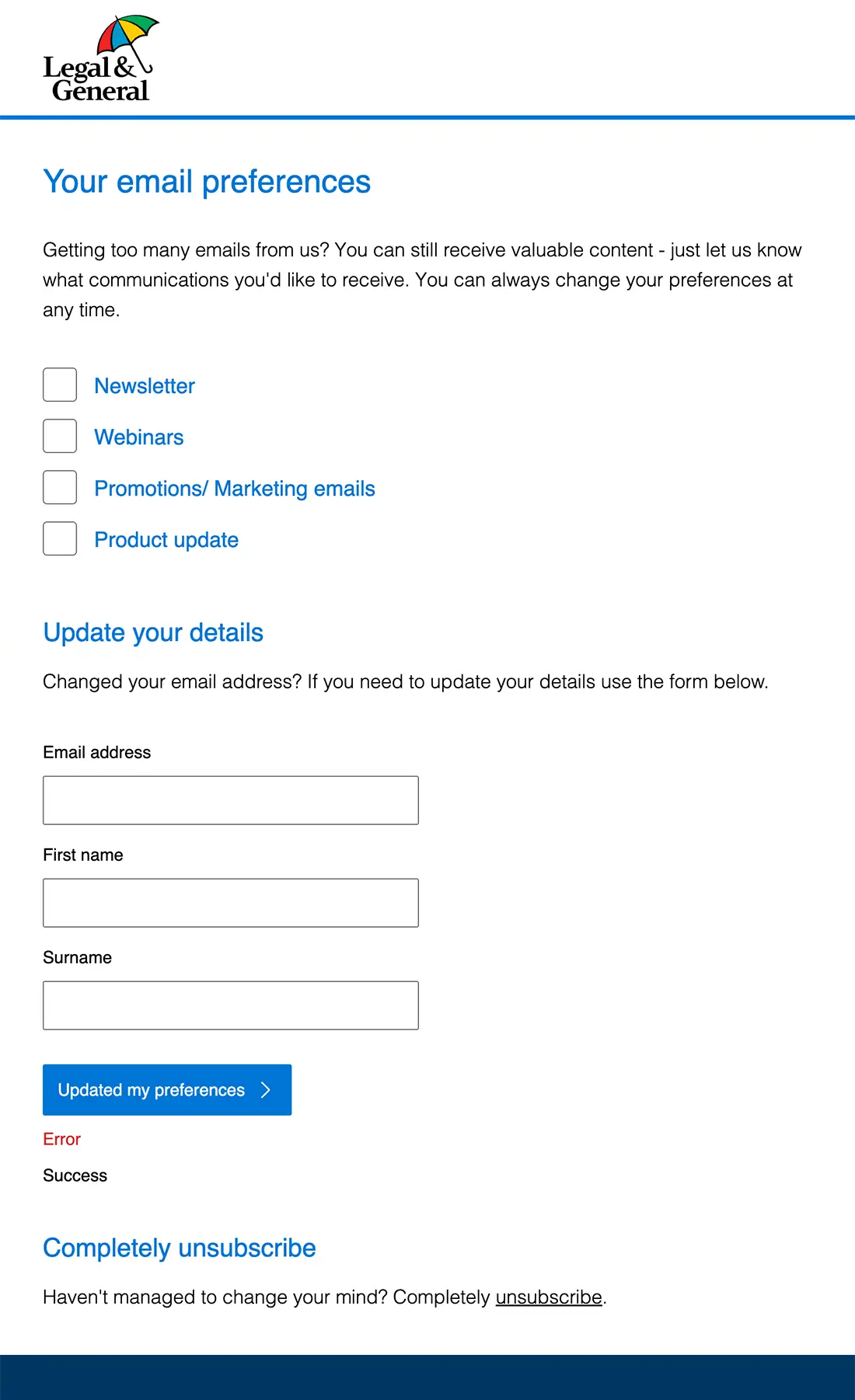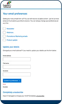 This also includes preference centres, which enable your customers to control the type of communications they receive from you so that they receive what’s relevant to them. This can reduce contacts unsubscribing from all your emails and increase the chances of communications of their choice being read and acted upon. They also allow the capture of further information which allows you to give your contacts a more personalised experience.