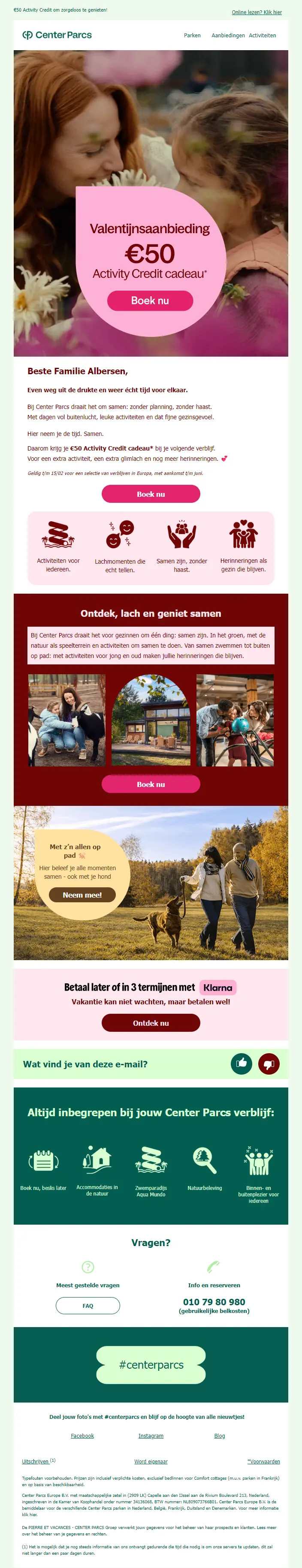 De mail opent met een GIF in de header: een moeder die met haar kind bloemen plukt. Dat zet meteen een warme toon neer. Wat slim is: Center Parcs is niet afgestapt van hun vaste e-mailindeling. Ze hebben alleen voor deze campagne de kleurstelling aangepast van groen naar roze. Daardoor blijft de mail herkenbaar als Center Parcs, maar voelt hij toch speciaal en thematisch. Daarnaast wordt Valentijn breder getrokken dan alleen romantische liefde. In de visuals zie je gezinnen, koppels én mensen met hun hond. Liefde in meerdere vormen dus.