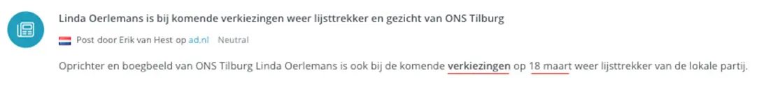 Een voorbeeld: zoek op ‘Amsterdam’ in combinatie met ‘verkiezingen’ en je krijgt berichten die over de verkiezingen gaan én waarin Amsterdam (of een gerelateerde plek) wordt genoemd.