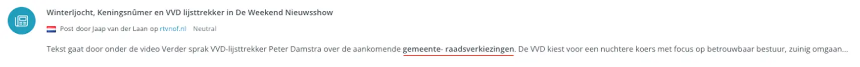 Bijvoorbeeld: wanneer je alleen zoekt op ‘verkiezingen’, krijg je wellicht ook nieuws over een aankomende misverkiezing. Dit kun je aanvullen met ((*verkiezing OR *verkiezingen) AND (maart)) om het resultaat scherp te houden. Zo verfijn je je zoekopdracht en houd je de monitoring gericht. Om de zoekopdracht uit te breiden kun je alle variaties meenemen in je zoekopdracht: (gemeenteraadsverkiezing* OR “gemeenteraads verkiezingen” OR “gemeenteraads verkiezing” OR “verkiezingen gemeenteraad” OR “gemeente raadsverkiezing” OR “gemeente raadsverkiezingen”)