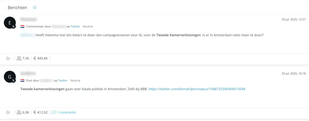 Een voorbeeld: zoek op ‘Amsterdam’ in combinatie met ‘verkiezingen’ en je krijgt berichten die over de verkiezingen gaan én waarin Amsterdam (of een gerelateerde plek) wordt genoemd.