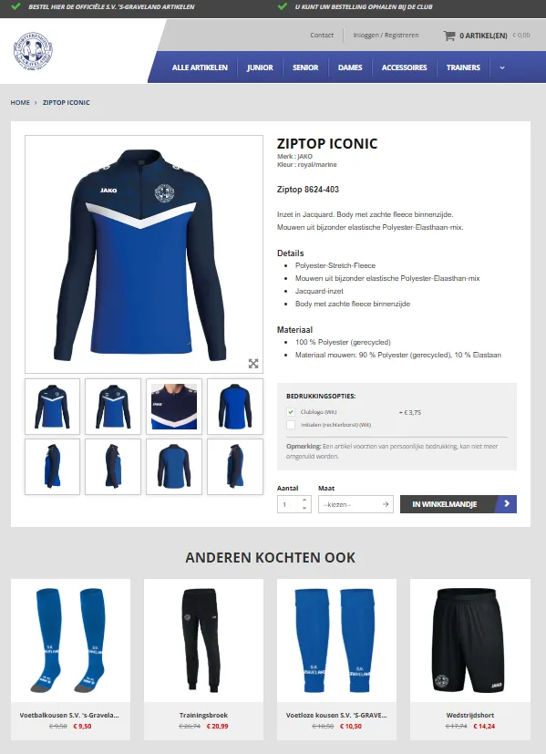 Het platform waarop de webshop van s.v. ‘s-Graveland draait, heet Clubwereld. Zij zorgen ervoor dat er voldoende retailers zijn die hun producten op de clubsite kunnen plaatsen, zij houden de voorraad bij, ze zorgen voor een koppeling met het ERP-systeem van de club en ze vullen zelfs het template voor de club met alle gewenste contentblokken.