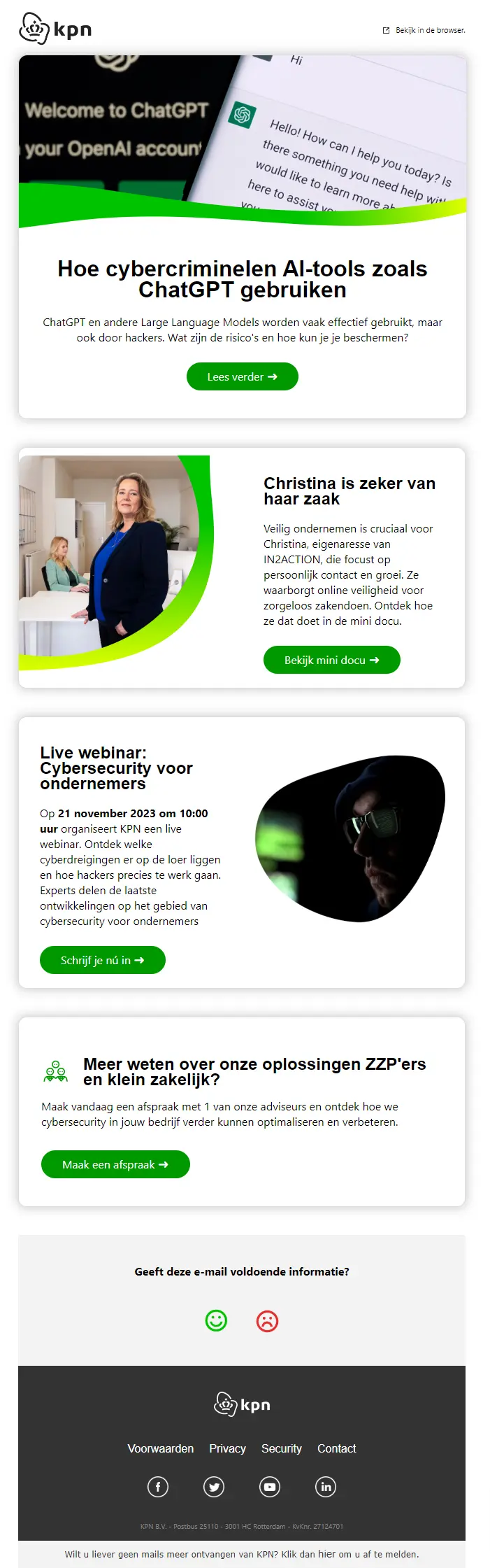 In de mail van KPN is het Framing Device of de Raamvertelling (de Nederlandstalige term) het vertaal rondom cyber security. Dat verhaal dient letterlijk als lijst rondom de verhalen van ChatGPT, de eigenaresse van IN2ACTION en hoe zij de beveiliging op orde kreeg, het webinar over cyber bedreigingen en de aandacht van de KPN voor dit thema voor de klein zakelijke markt.