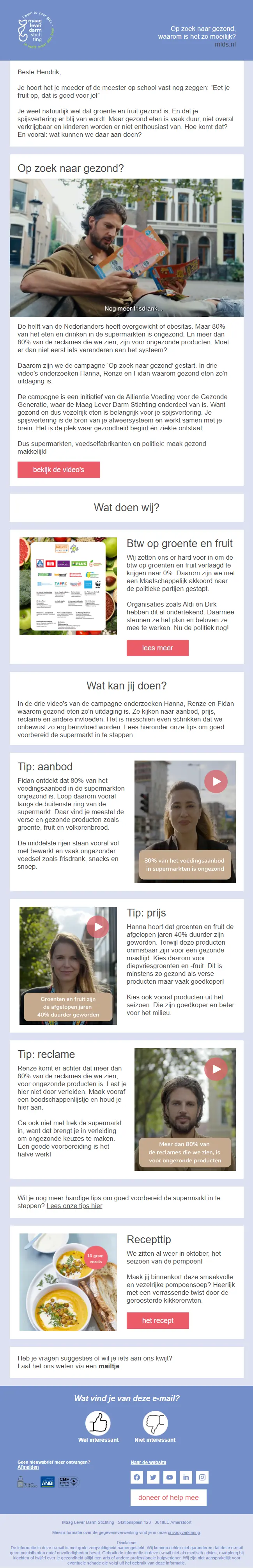 Hoeveel mails starten met Je hoort het je moeder of de meester op school vast nog zeggen: “Eet je fruit op, dat is goed voor!” ? Om vervolgens deze voor velen bekende uitspraak te koppelen aan de campagne ‘Op zoek naar Gezond’ van de Alliantie Voeding waar de Maag Lever Darm Stichting graag aandacht voor vraagt. Ook mooi dat de mail eerst uitlegt wat de stichting zelf onderneemt en daarna content toevoegt onder het kopje ‘Wat kan jij doen?’.