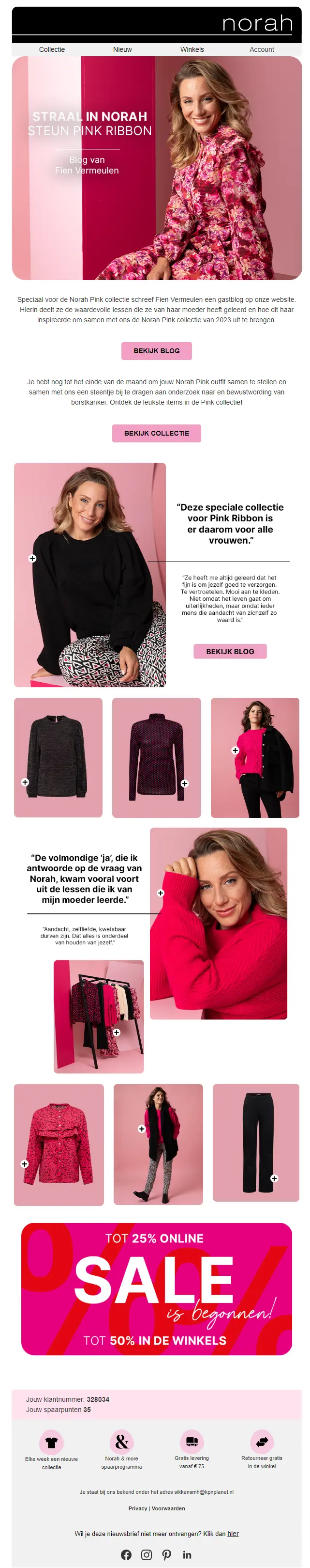 In de mail van Norah , trendy webshop voor dameskleding, wordt het verhaal verteld van Fien Vermeulen. Zij is het gezicht van Norah’s Pink Collectie, een collectie voor Pink Ribbon. Fien is radio DJ, presentratice, auteur en columniste voor AD. Fien schrijft: