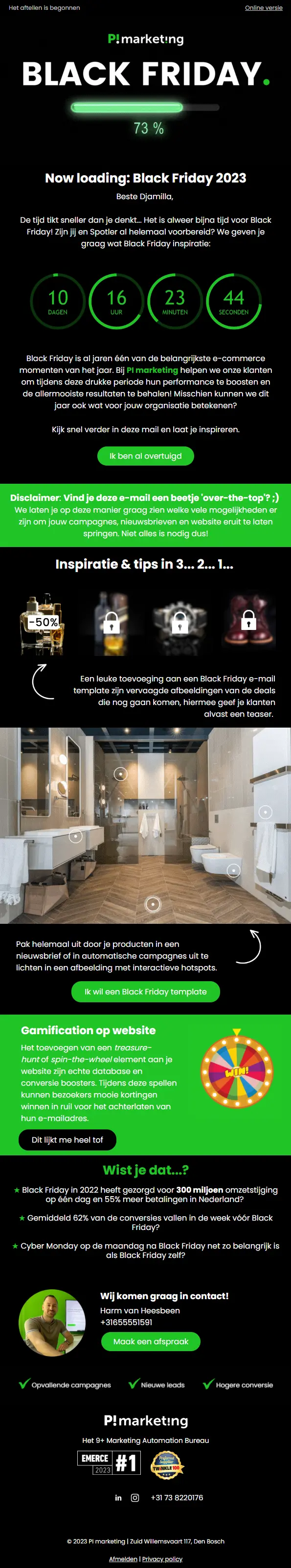 Elk element in je verhaal moet ertoe doen. Ons oog viel daarom op een mail van PI Marketing. Vooral in een Black Friday Mailcampagne is het heerlijk om te werken met een Chekhov’s Gun. Details van je grote Black Friday-verhaal kun je prima introduceren met een percentagebalk die langzaam volloopt, een countdowntimer, vervaagde afbeeldingen, interactieve hotspots in een afbeelding of een spin-the-weel-element. Je voegt zo’n element toe aan een eerste mail en je laat het element of het belang ervan in een volgende mail terugkomen. Het is een beproefd recept dat zeker ook goed werkt in commerciële mailings.