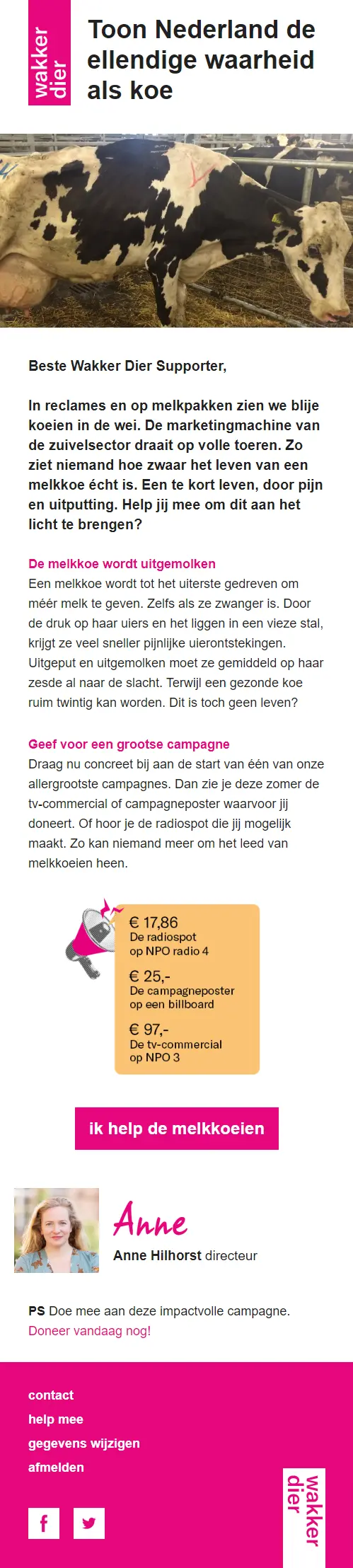 En werkt zo’n storytellingtechniek een beetje? Als je de cijfers induikt, dan zie je dat deze mail – als voorbeeld – een hoge openratio van 45,3% scoort. En ook voor Wakker Dier is dit een bovengemiddeld hoog percentage.  Toch is uit zo’n cijfer niet één-op-één te concluderen dat de gehanteerde storytellingtechniek voor dit betere resultaat heeft gezorgd. In e-mail marketing spelen immers veel facetten een rol: doelgroepselectie, tijdstip van verzenden, inbedding in andere en lopende acties etc. Wil je hier voor je eigen marketing zicht op krijgen, dan is het advies: richt een A/B-test in waarin je deze techniek test.