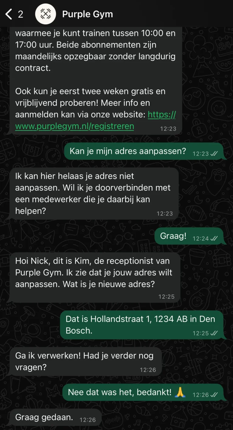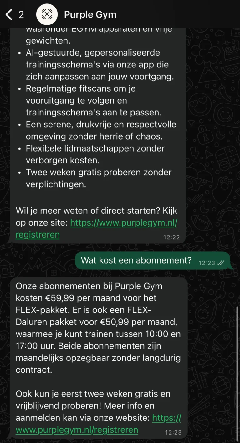 In plaats van de bestaande aanpak verder te optimaliseren, koos Purple Gym voor een andere benadering: communiceren via WhatsApp en via een AI-chatbot.