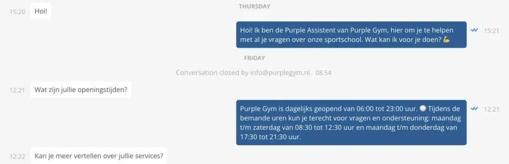 Ook de implementatie verliep relatief snel. De AI-chatbot was binnen ongeveer 2 weken operationeel en Spotler Message werd binnen 2 tot 3 dagen ingericht. Daardoor kon Purple Gym al snel starten met de nieuwe manier van werken.