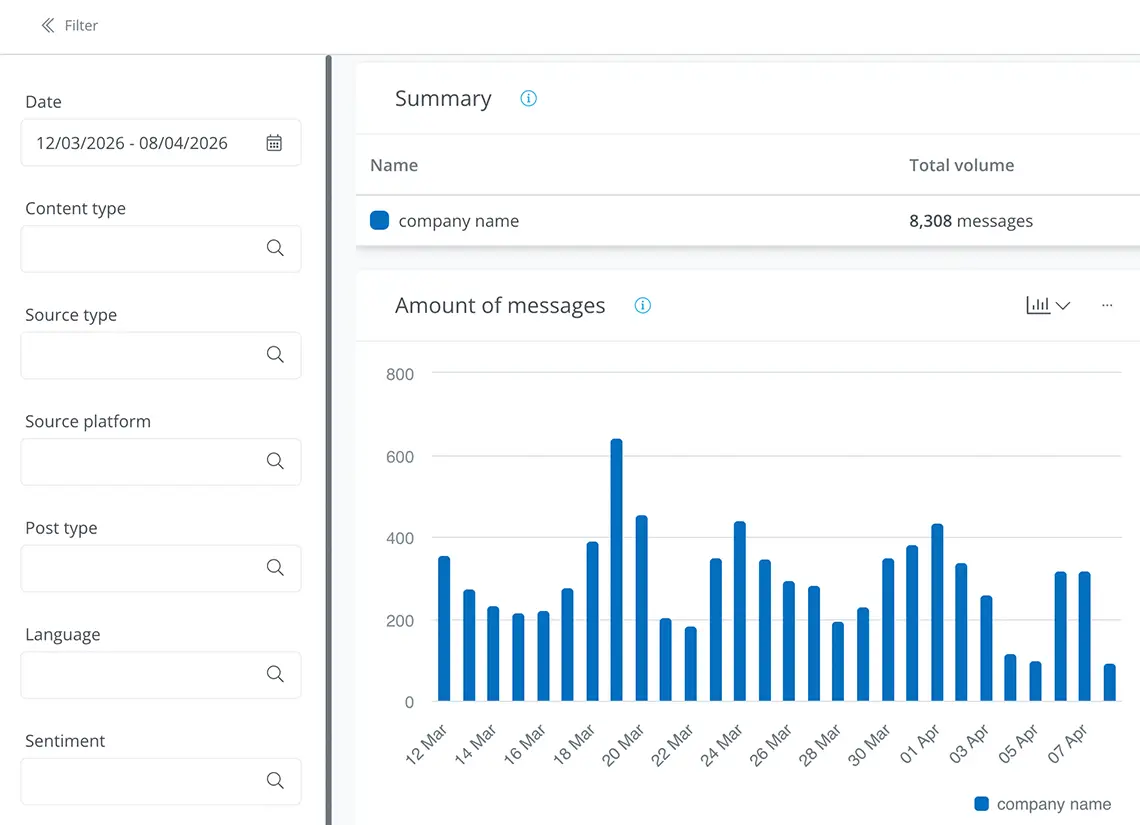 Filter berichten op bron, sentiment, onderwerp of bereik en focus alleen op wat voor jou relevant is.