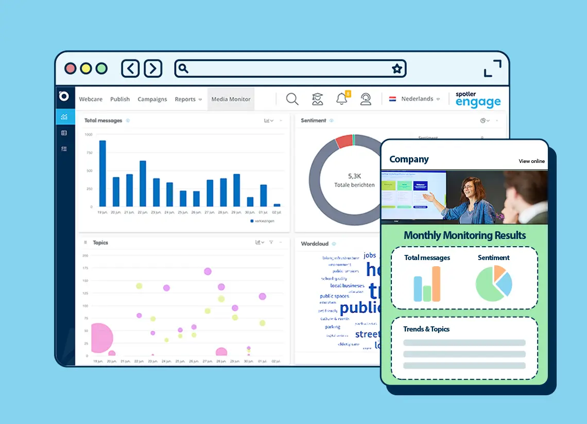 Ontdek trends, meet bereik en sentiment en zie wat het effect is van je communicatie. Met duidelijke analyses en visuele rapportages vertaal je data snel naar concrete acties.
