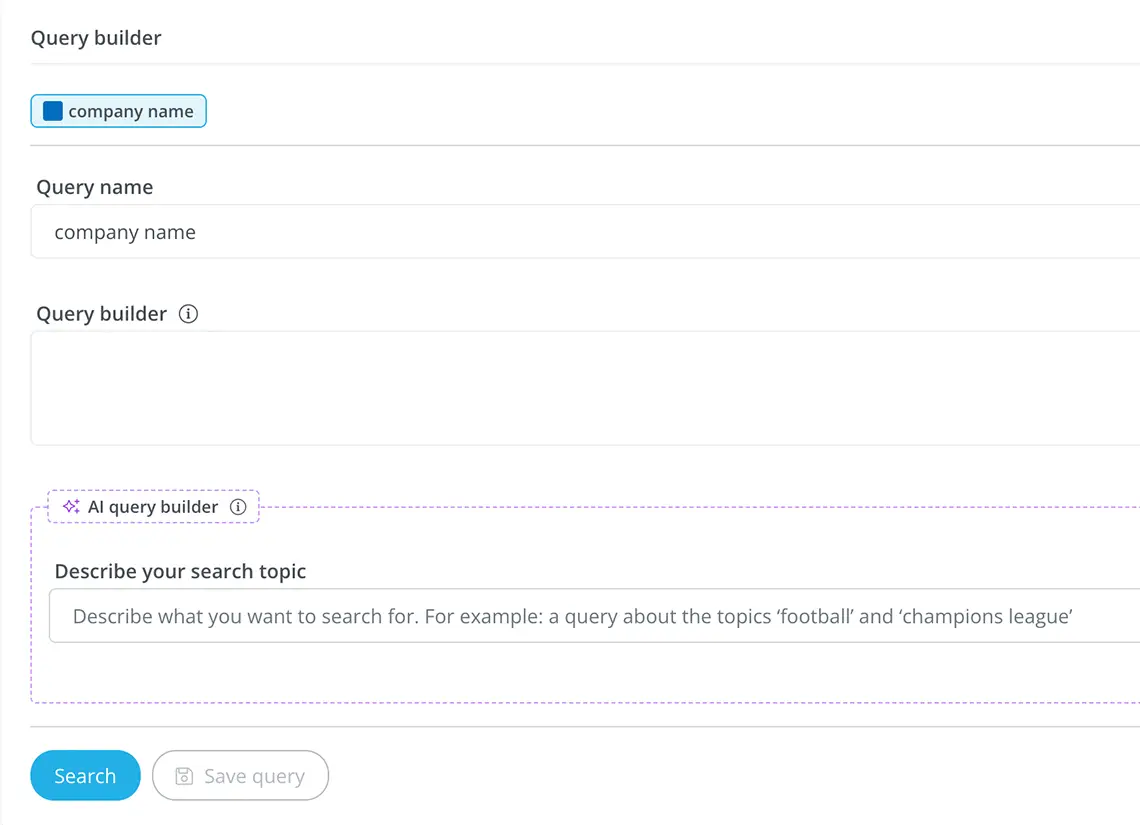 Vind de belangrijkste onderwerpen met behulp van de AI topic generator, die je helpt om informatie snel te duiden. Gebruik daarnaast de query builder om eenvoudig zoekopdrachten op te stellen.