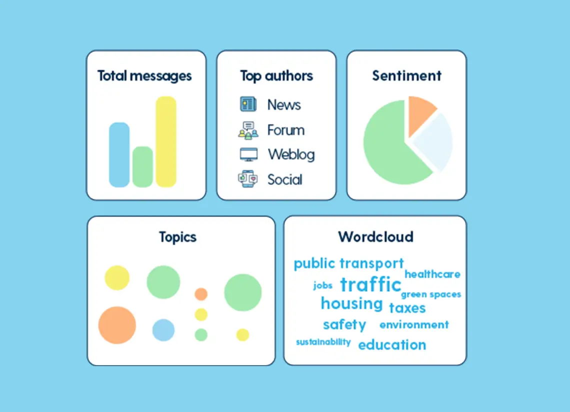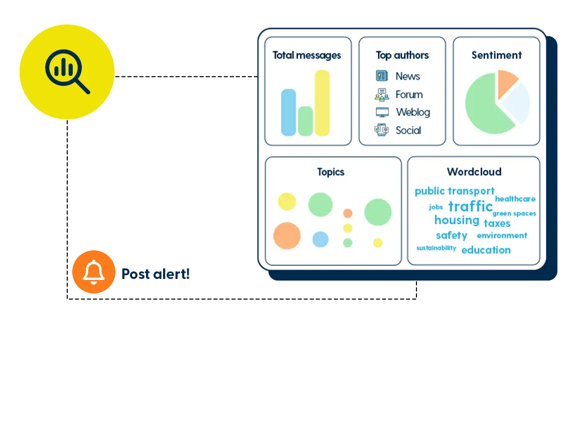 Krijg realtime inzicht in wat er on- en offline over je organisatie wordt gezegd. Door alle berichten op één plek te verzamelen en slim te filteren, herken je snel wat relevant is en kun je direct inspelen op signalen die ertoe doen.