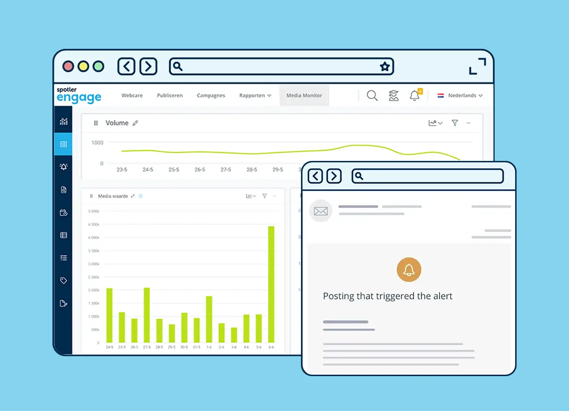 Ontvang direct meldingen bij belangrijke berichten, trends of pieken in activiteit, zodat je altijd op tijd kunt reageren.