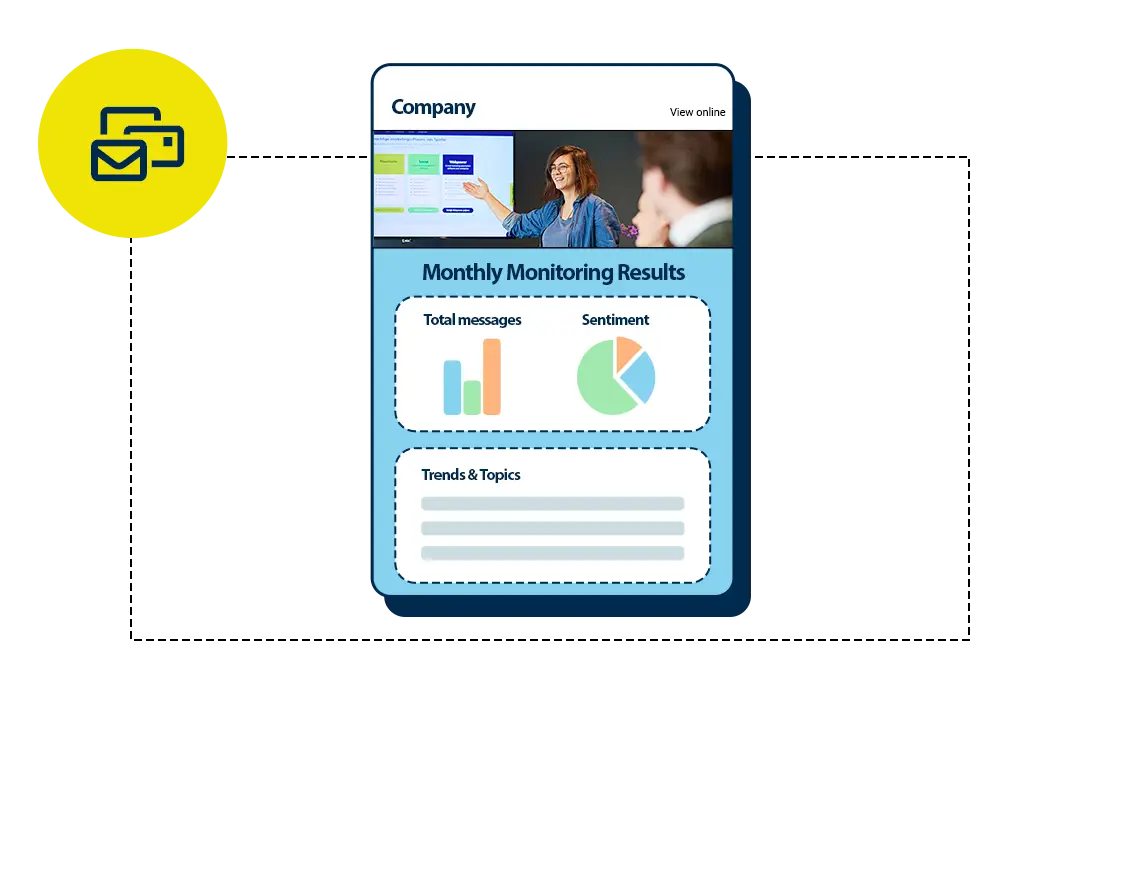 Houd collega’s en stakeholders op de hoogte met automatische nieuwsbrieven en deelbare rapportages. In je eigen huisstijl en direct klaar om te delen, van e-mail tot narrowcasting.